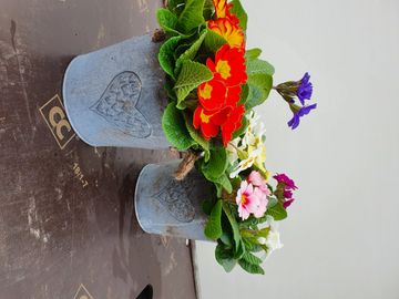 This bucket comes with an embossed heart along with two rope handles either side. They are filled with primroses and polyanthus